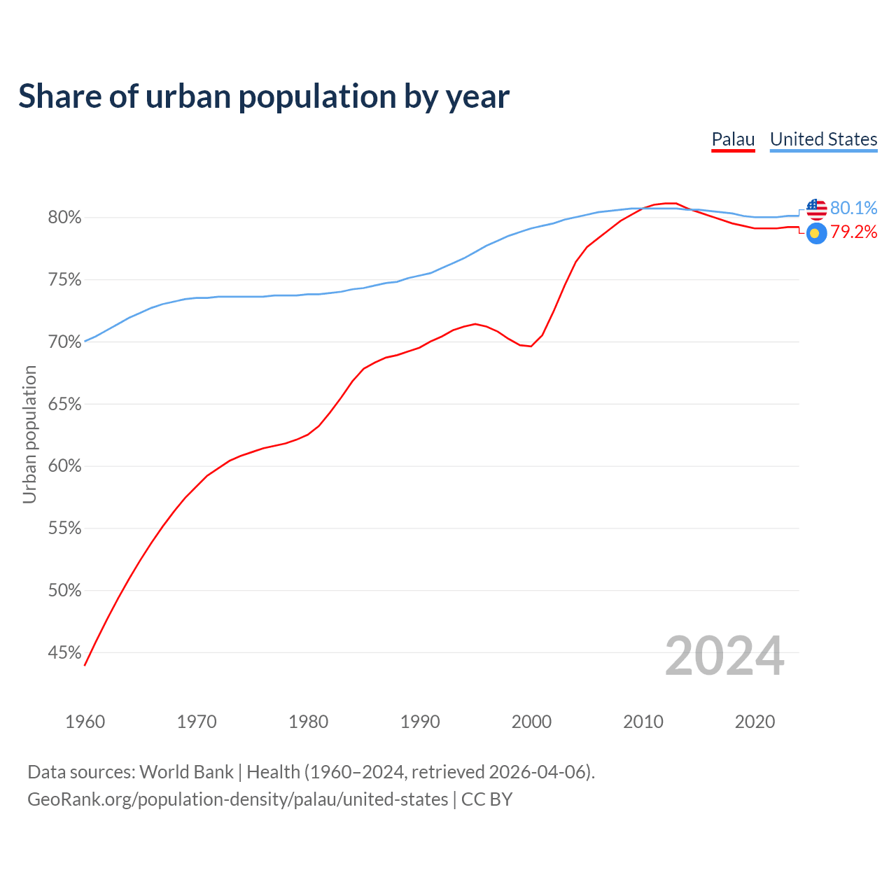 From 2004 to 2024, the share of urban population changed from 76.4% to 79.2% in Palau and from 80% to 80.1% in the United States.
