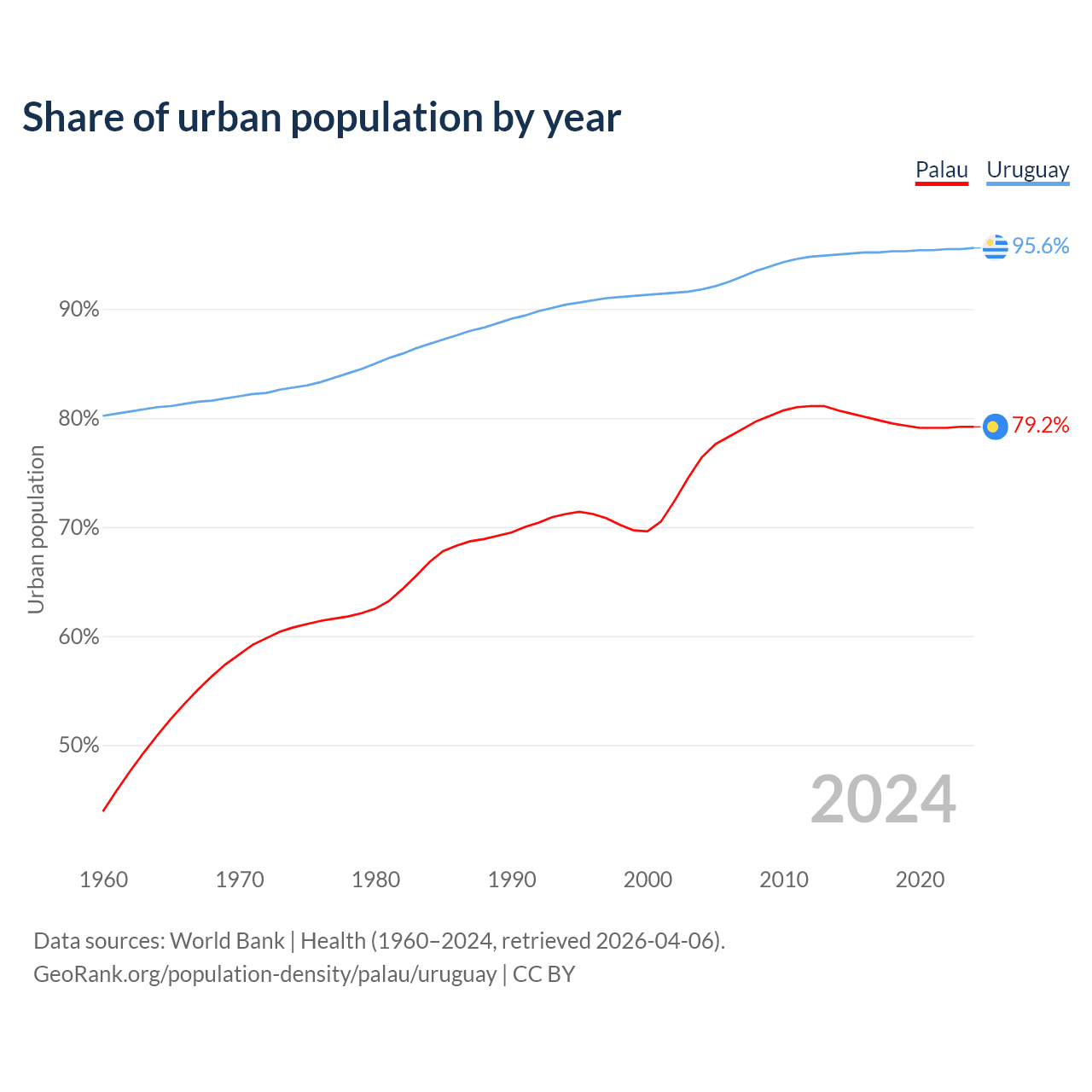 From 2004 to 2024, the share of urban population changed from 76.4% to 79.2% in Palau and from 91.8% to 95.6% in Uruguay.