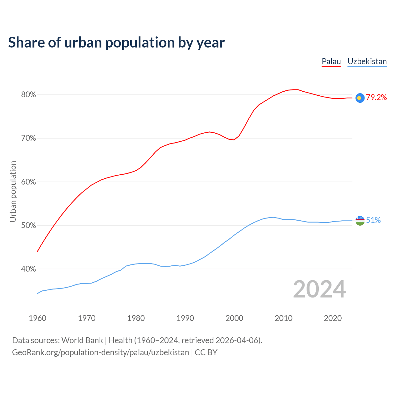 From 2004 to 2024, the share of urban population changed from 76.4% to 79.2% in Palau and from 50.6% to 51% in Uzbekistan.