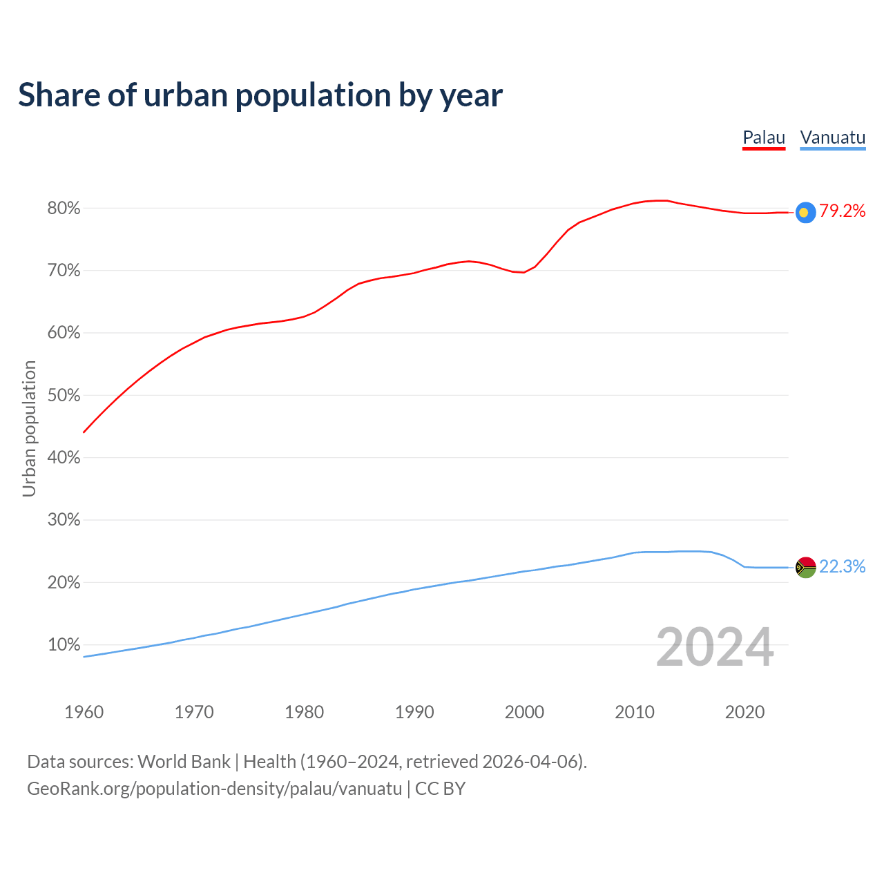 From 2004 to 2024, the share of urban population changed from 76.4% to 79.2% in Palau and from 22.7% to 22.3% in Vanuatu.