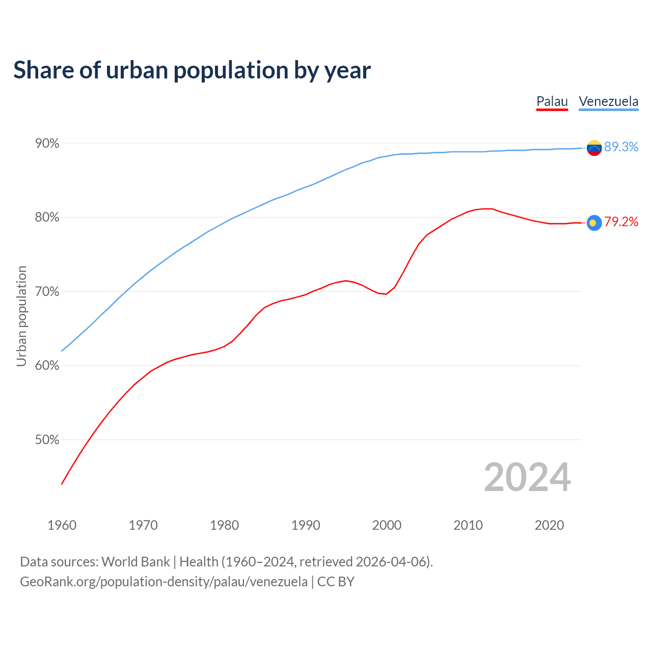 From 2004 to 2024, the share of urban population changed from 76.4% to 79.2% in Palau and from 88.6% to 89.3% in Venezuela.