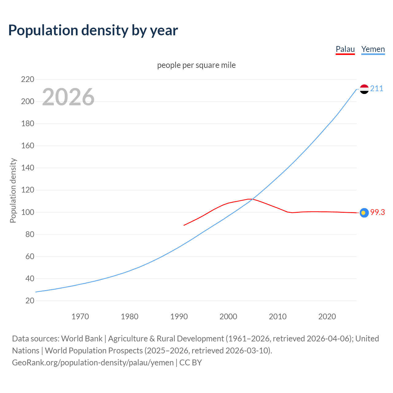 From 2006 to 2026, population density in Palau decreased by 10%, compared to a 82.6% growth in Yemen.