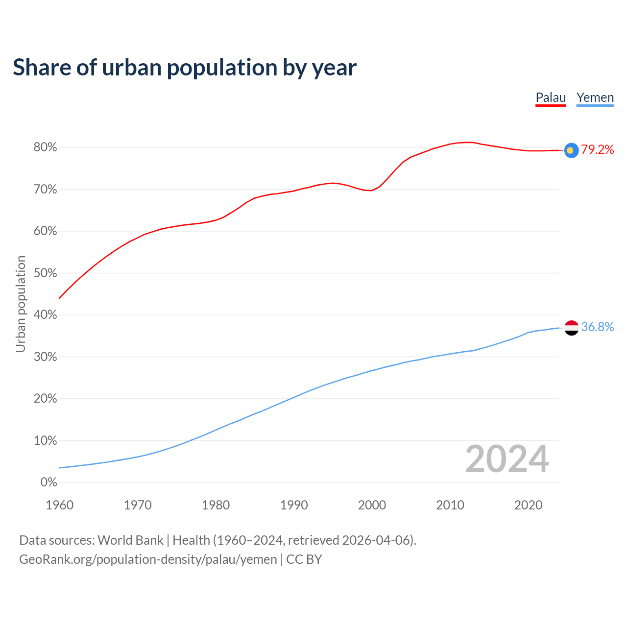 From 2004 to 2024, the share of urban population changed from 76.4% to 79.2% in Palau and from 28.5% to 36.8% in Yemen.