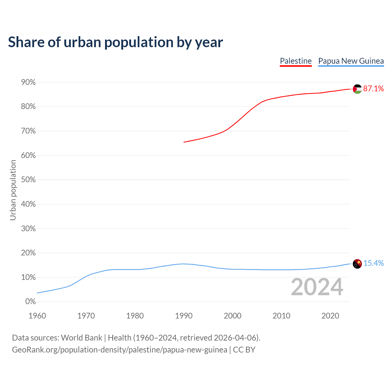 From 2004 to 2024, the share of urban population changed from 79% to 87.1% in Palestine and from 13.1% to 15.4% in Papua New Guinea.