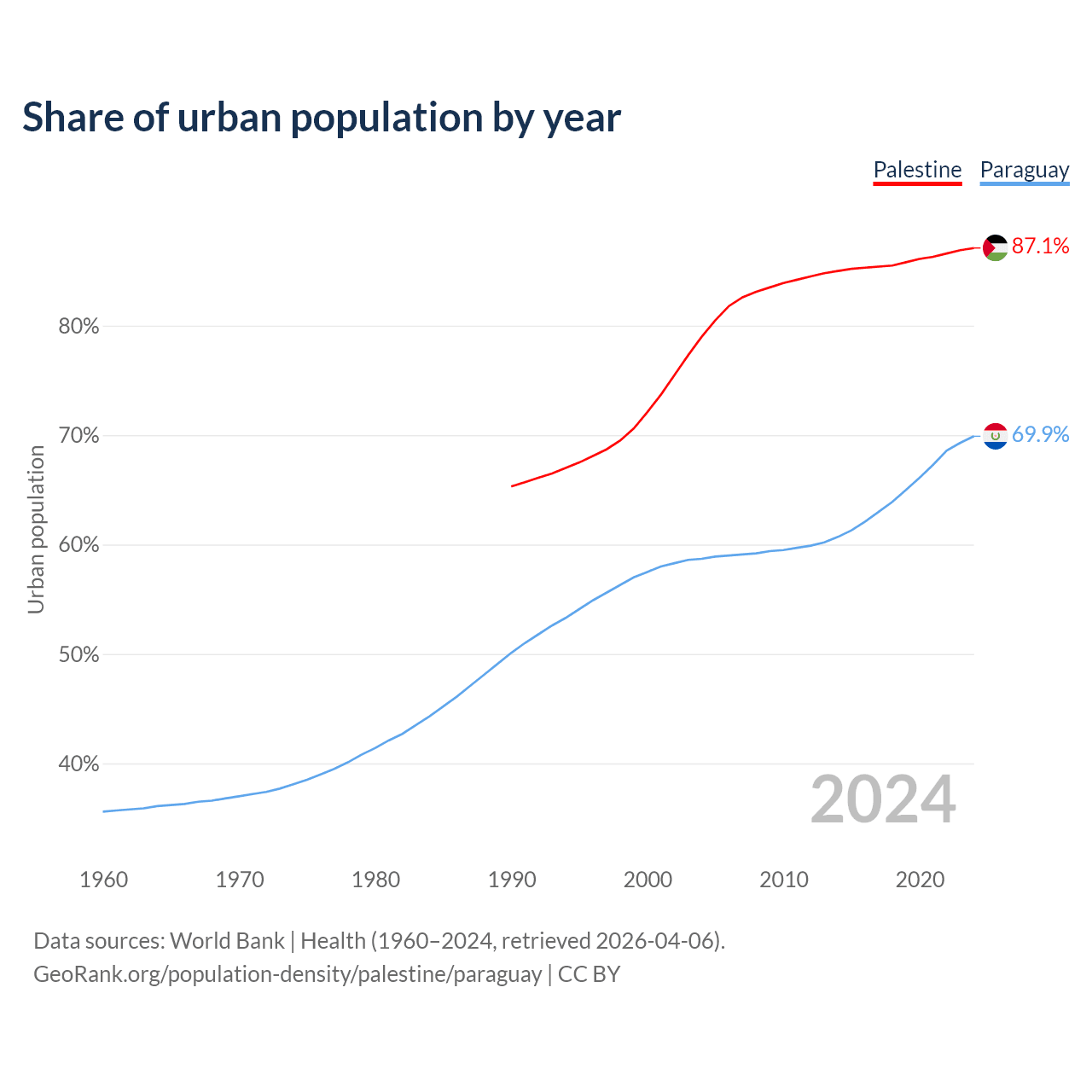 From 2004 to 2024, the share of urban population changed from 79% to 87.1% in Palestine and from 58.7% to 69.9% in Paraguay.