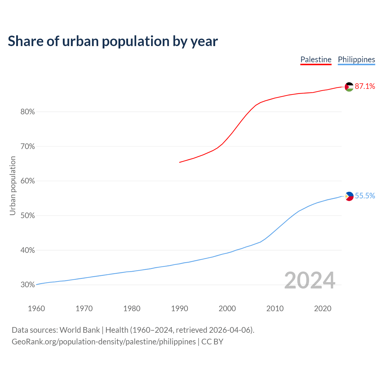 From 2004 to 2024, the share of urban population changed from 79% to 87.1% in Palestine and from 40.9% to 55.5% in the Philippines.