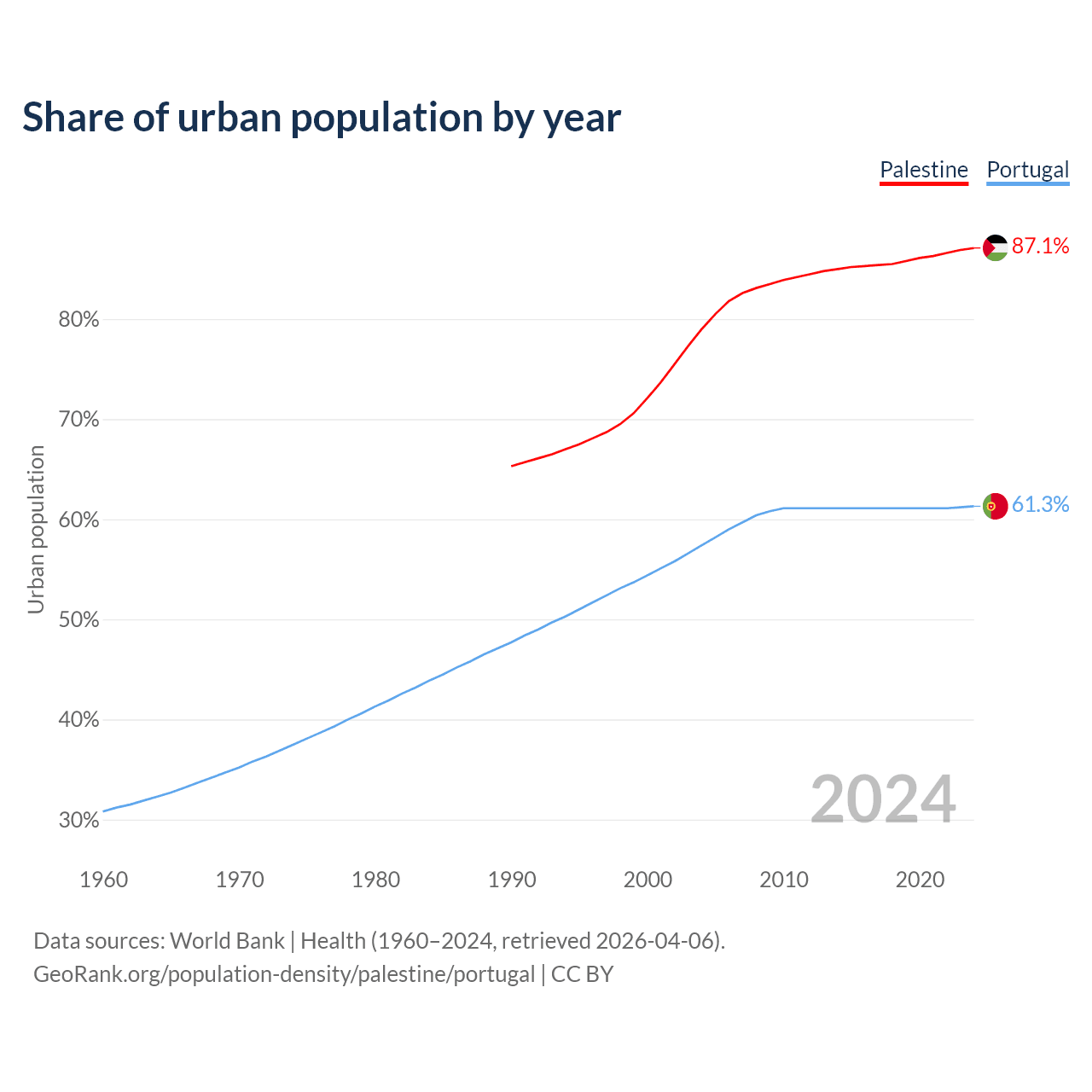 From 2004 to 2024, the share of urban population changed from 79% to 87.1% in Palestine and from 57.4% to 61.3% in Portugal.