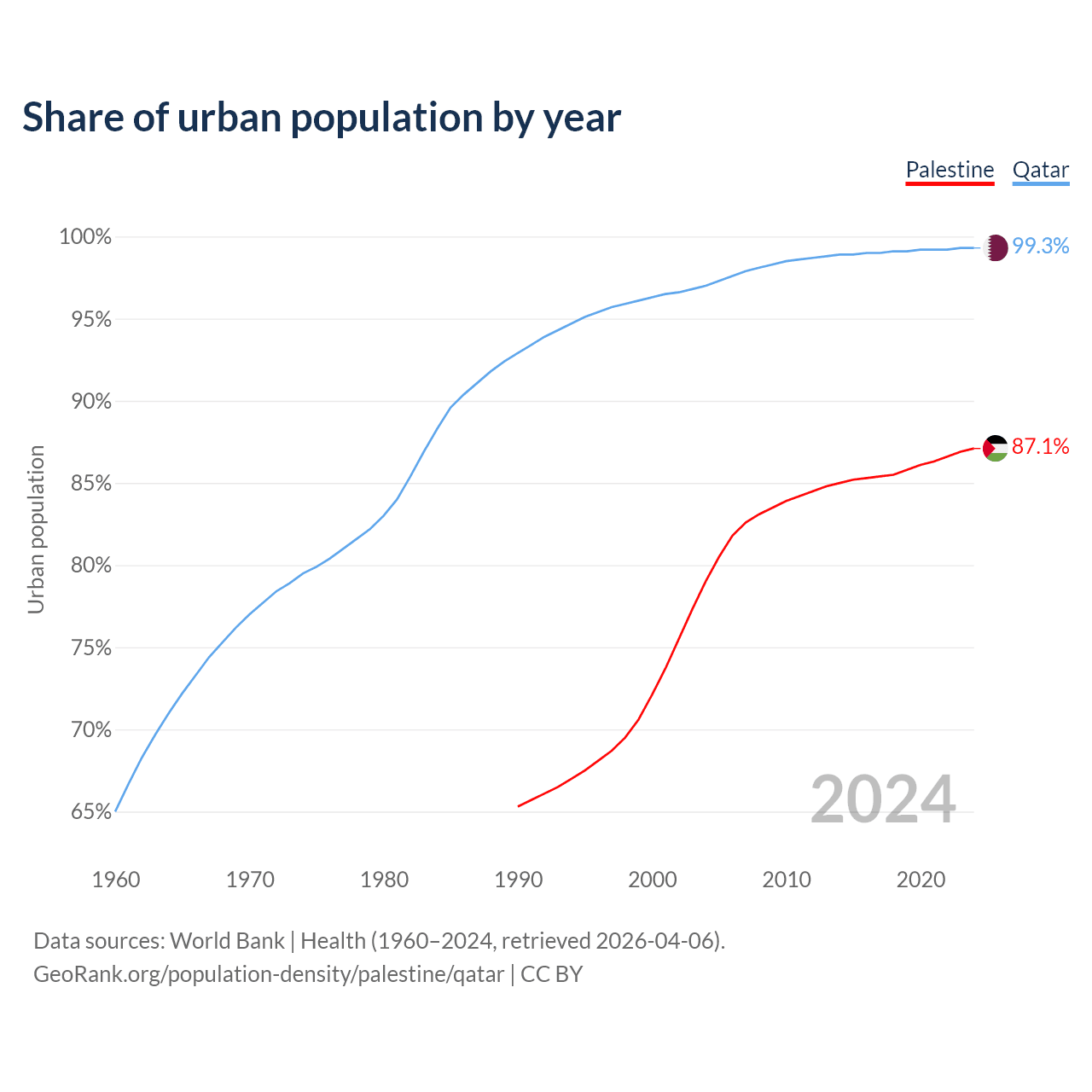 From 2004 to 2024, the share of urban population changed from 79% to 87.1% in Palestine and from 97% to 99.3% in Qatar.