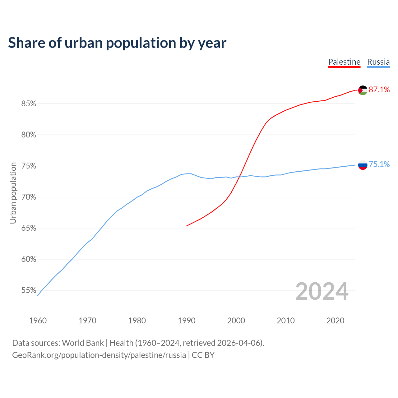 From 2004 to 2024, the share of urban population changed from 79% to 87.1% in Palestine and from 73.3% to 75.1% in Russia.