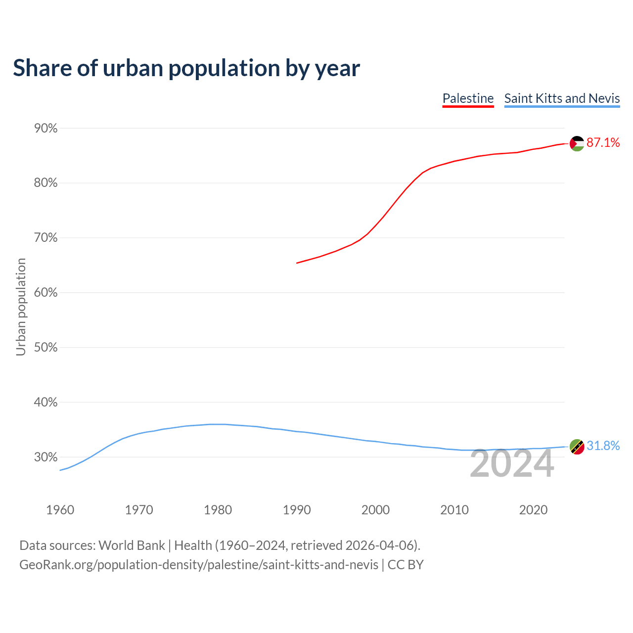 From 2004 to 2024, the share of urban population changed from 79% to 87.1% in Palestine and from 32.1% to 31.8% in Saint Kitts and Nevis.