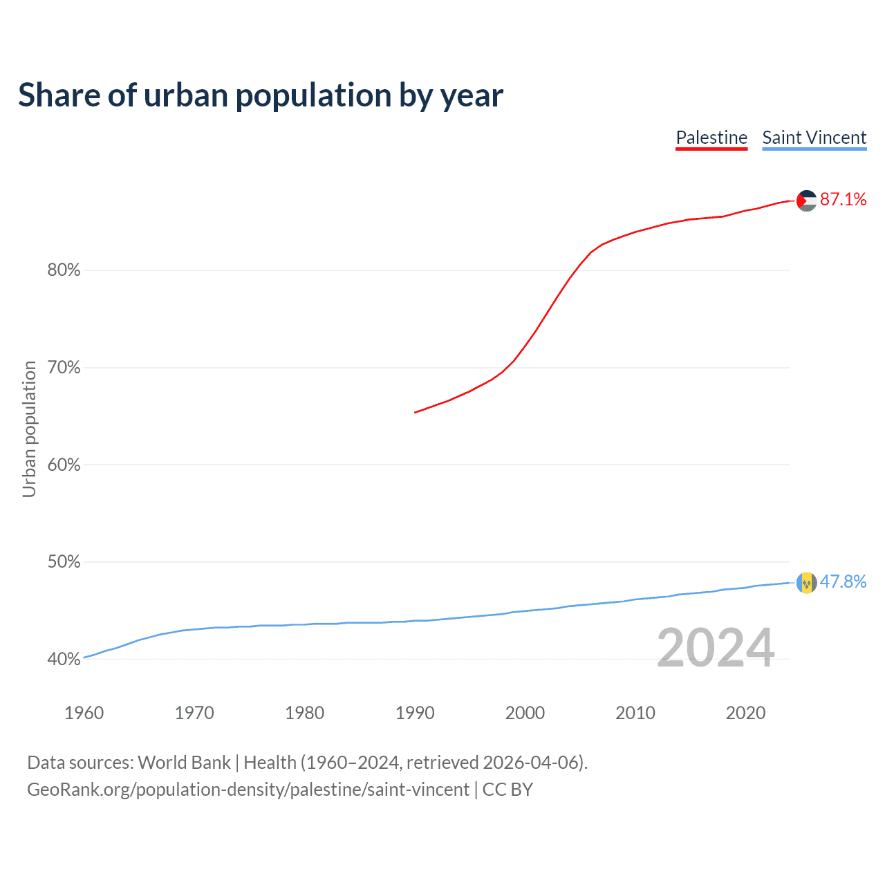 From 2004 to 2024, the share of urban population changed from 79% to 87.1% in Palestine and from 45.4% to 47.8% in Saint Vincent.