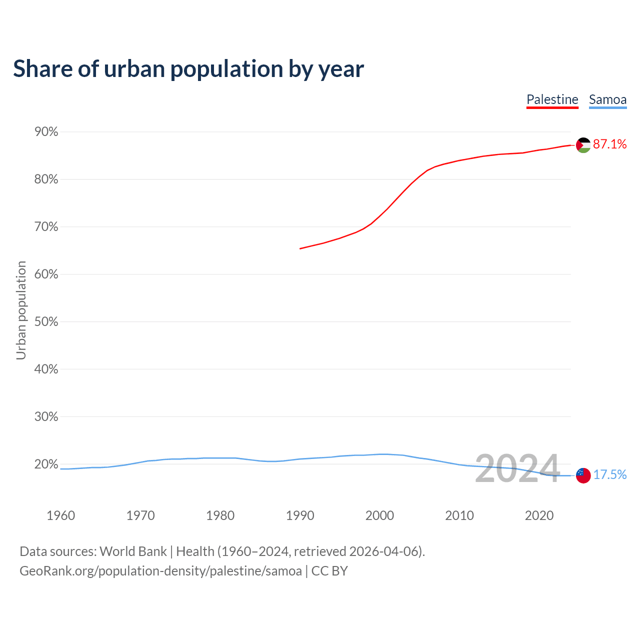 From 2004 to 2024, the share of urban population changed from 79% to 87.1% in Palestine and from 21.5% to 17.5% in Samoa.