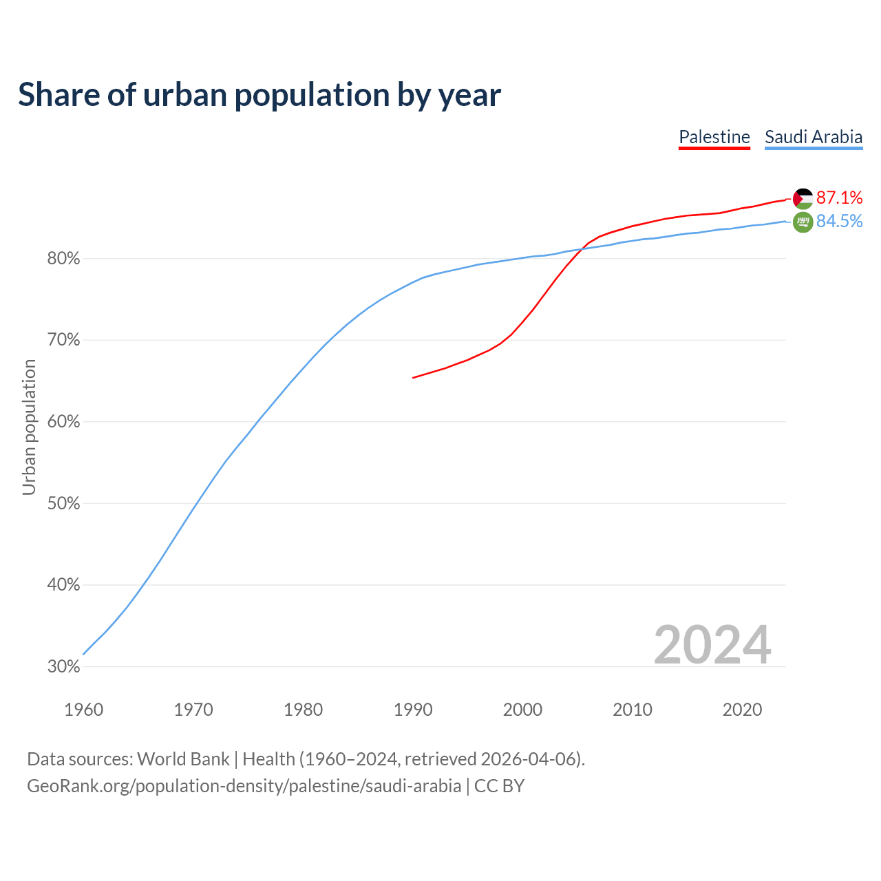 From 2004 to 2024, the share of urban population changed from 79% to 87.1% in Palestine and from 80.8% to 84.5% in Saudi Arabia.