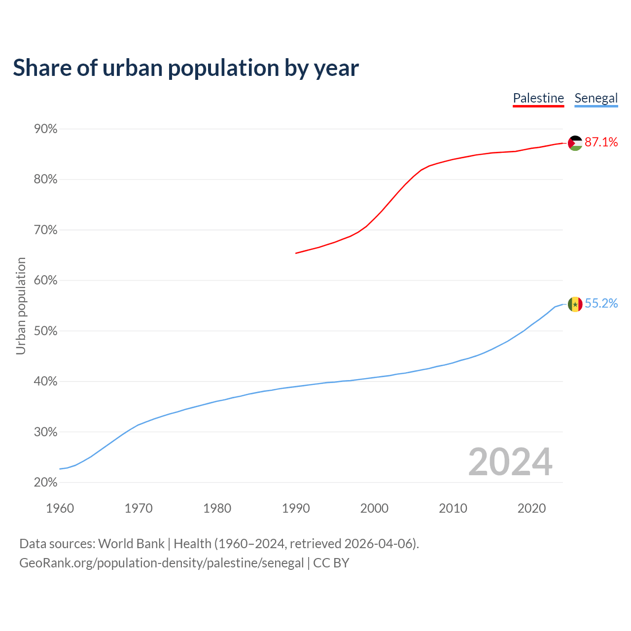 From 2004 to 2024, the share of urban population changed from 79% to 87.1% in Palestine and from 41.6% to 55.2% in Senegal.