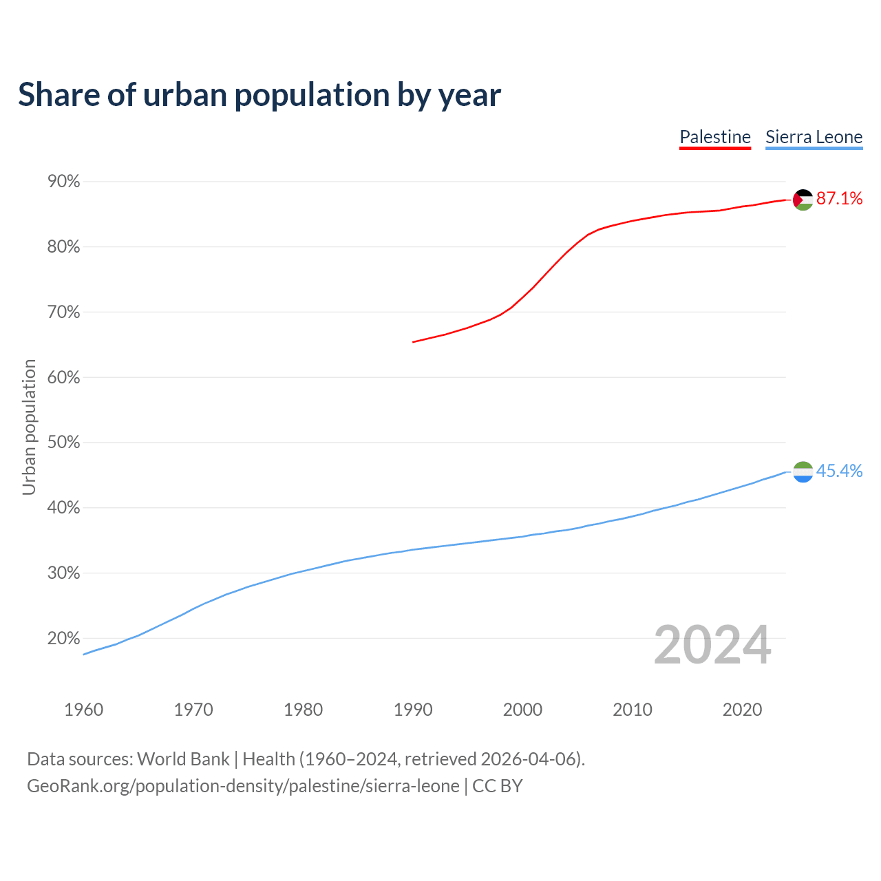 From 2004 to 2024, the share of urban population changed from 79% to 87.1% in Palestine and from 36.5% to 45.4% in Sierra Leone.