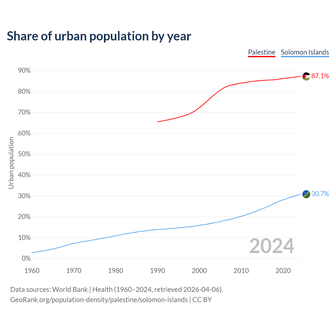 From 2004 to 2024, the share of urban population changed from 79% to 87.1% in Palestine and from 17.2% to 30.7% in the Solomon Islands.