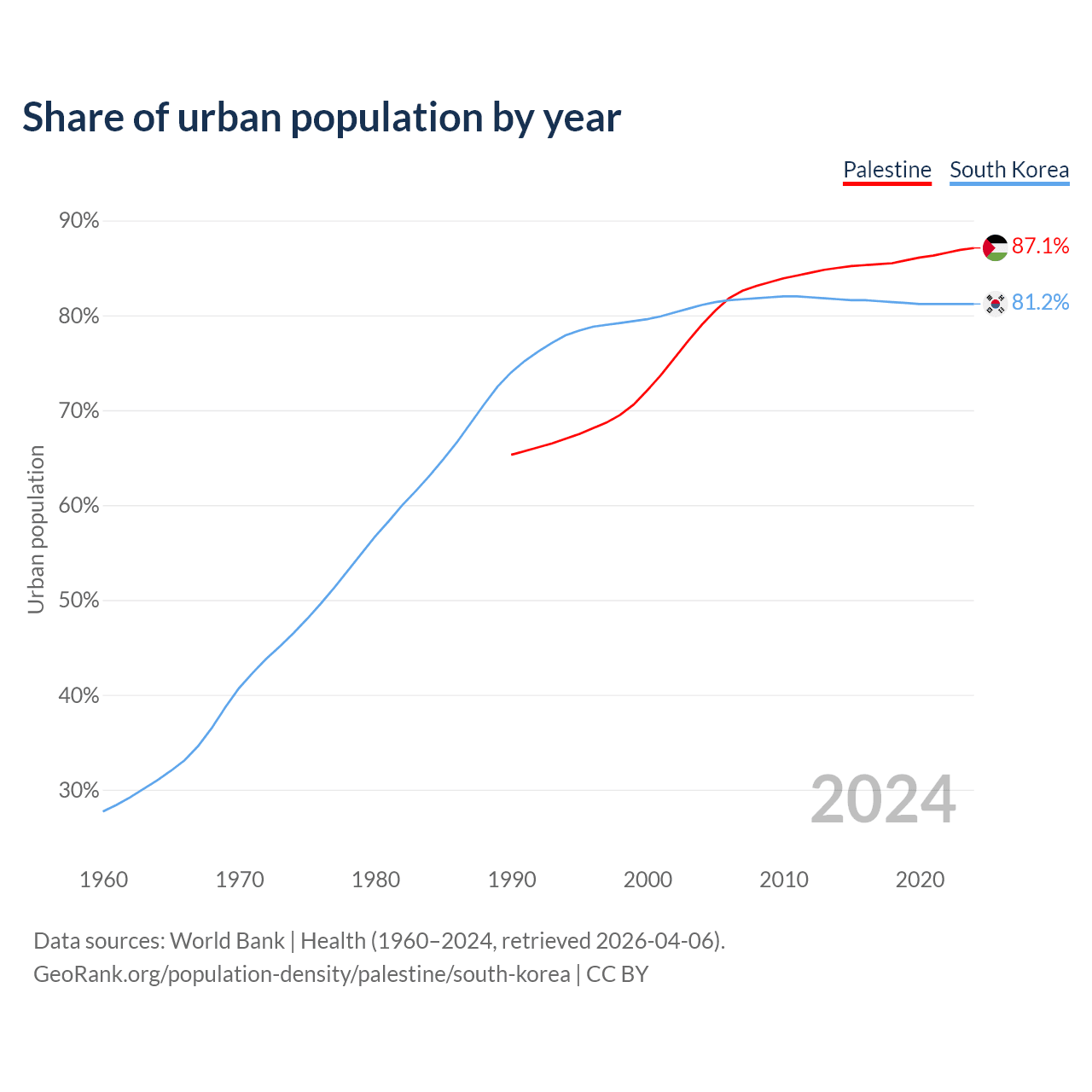 From 2004 to 2024, the share of urban population changed from 79% to 87.1% in Palestine and from 81.1% to 81.2% in South Korea.