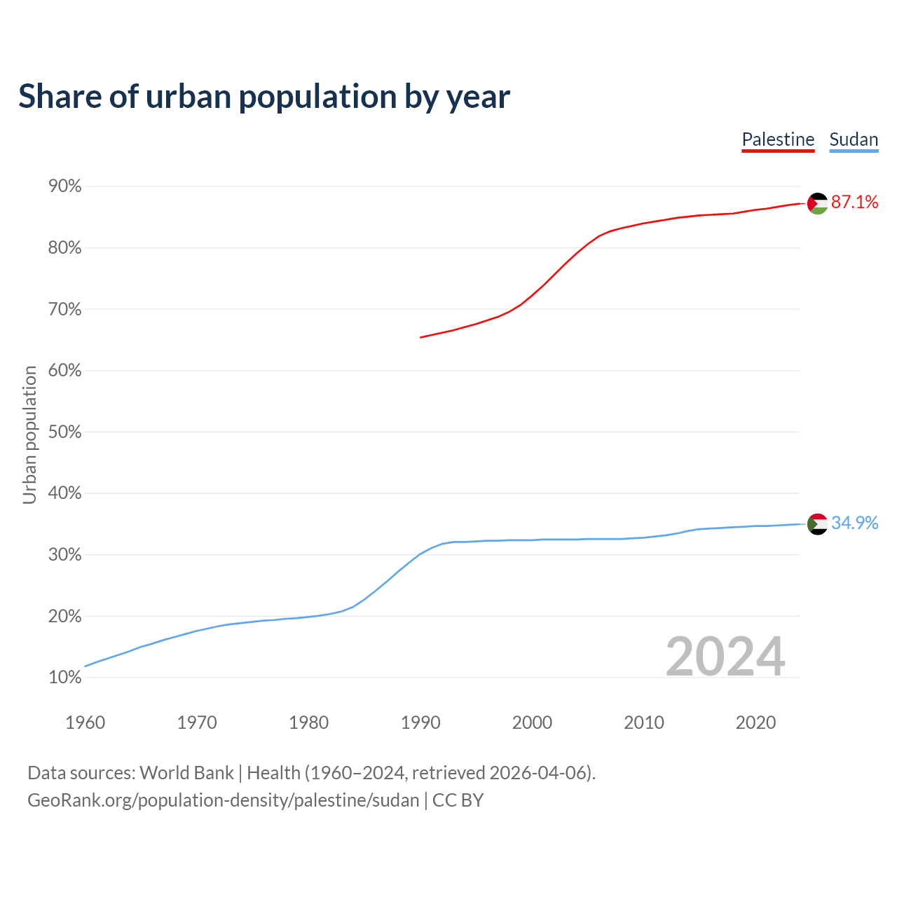 From 2004 to 2024, the share of urban population changed from 79% to 87.1% in Palestine and from 32.4% to 34.9% in Sudan.