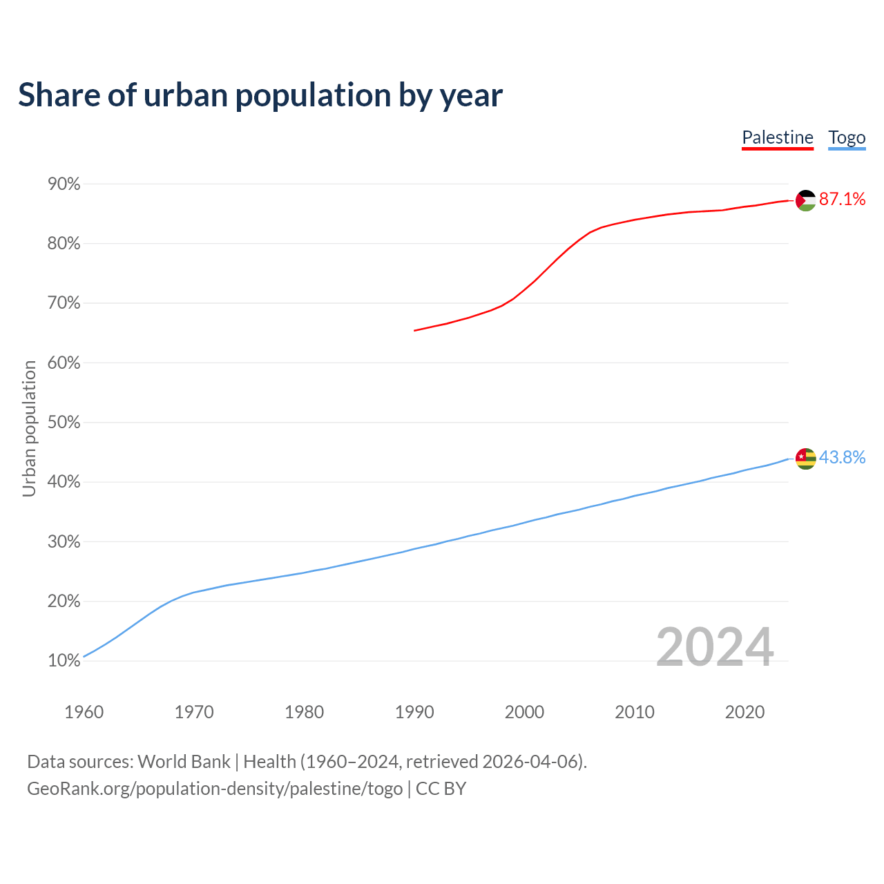 From 2004 to 2024, the share of urban population changed from 79% to 87.1% in Palestine and from 34.9% to 43.8% in Togo.