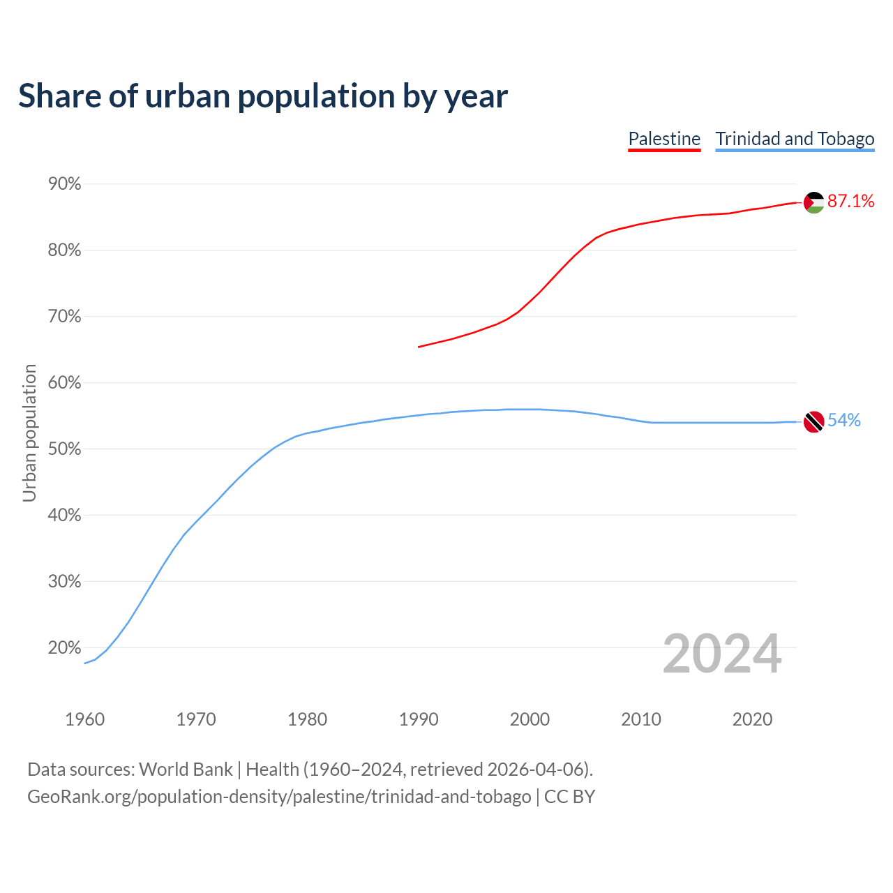 From 2004 to 2024, the share of urban population changed from 79% to 87.1% in Palestine and from 55.6% to 54% in Trinidad and Tobago.
