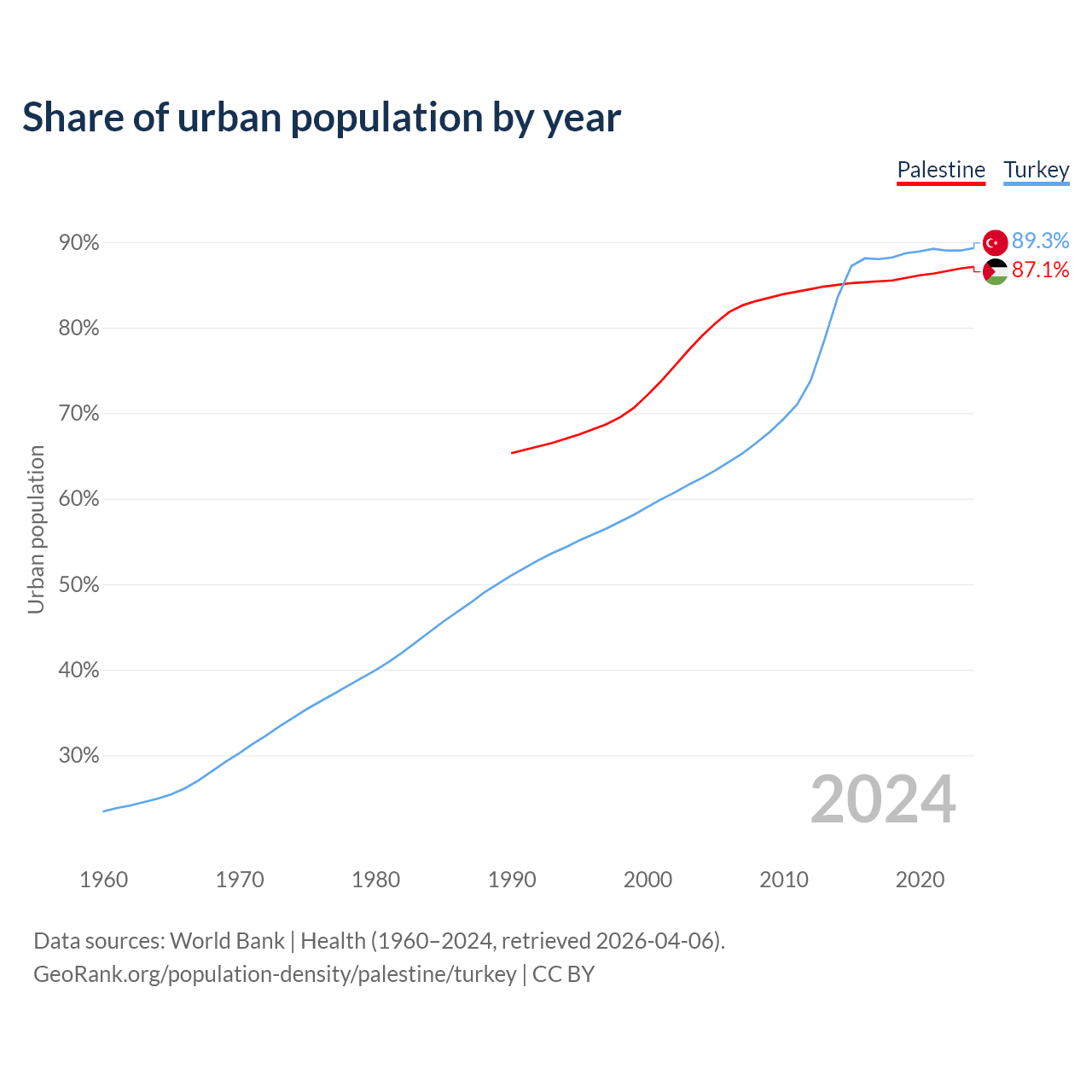 From 2004 to 2024, the share of urban population changed from 79% to 87.1% in Palestine and from 62.4% to 89.3% in Turkey.