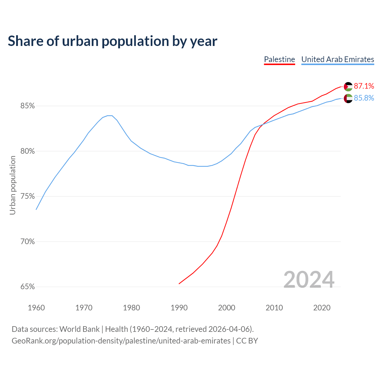 From 2004 to 2024, the share of urban population changed from 79% to 87.1% in Palestine and from 81.5% to 85.8% in the United Arab Emirates.