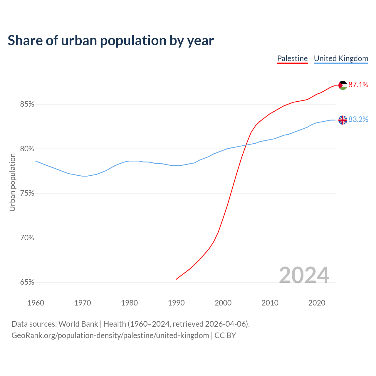 From 2004 to 2024, the share of urban population changed from 79% to 87.1% in Palestine and from 80.3% to 83.2% in the United Kingdom.