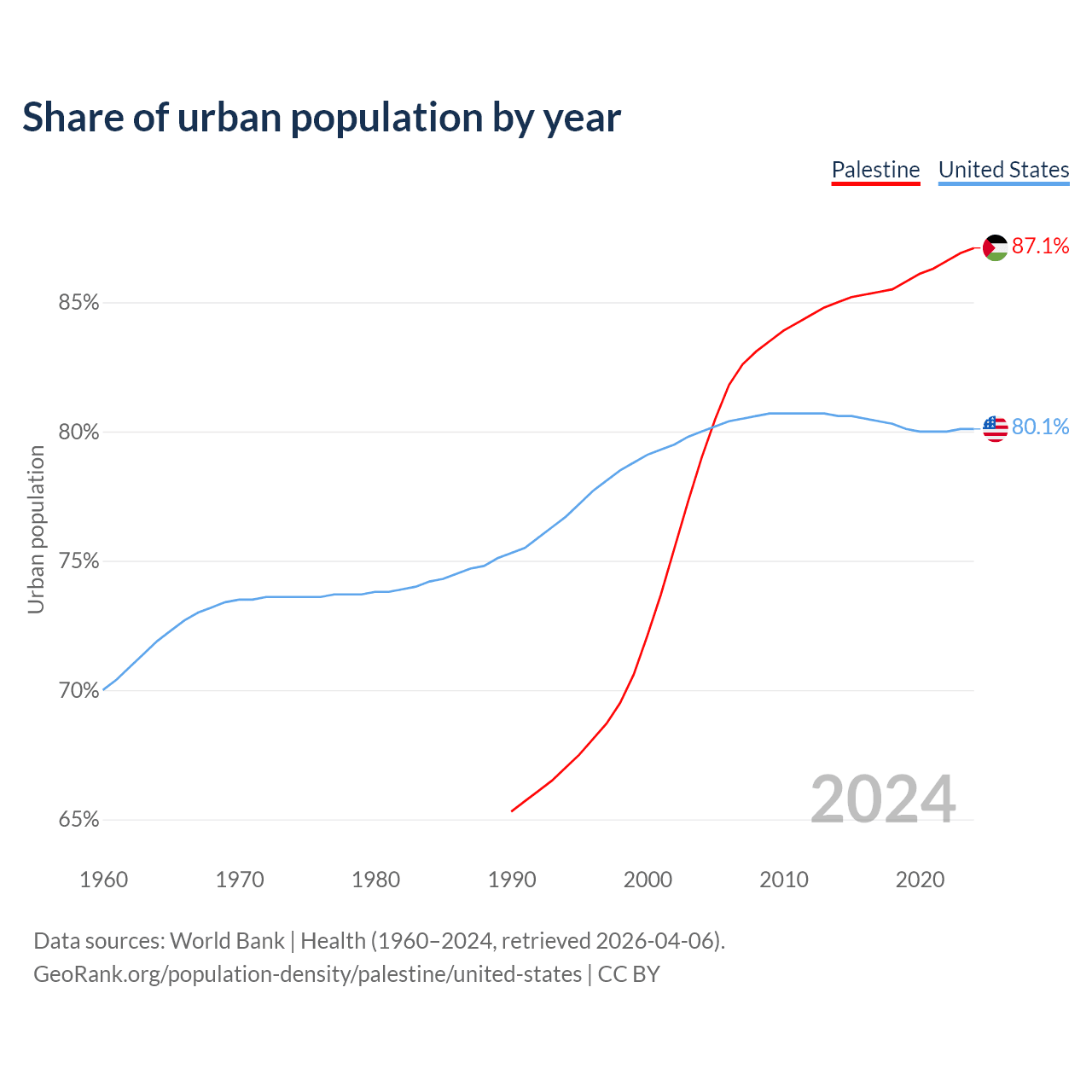 From 2004 to 2024, the share of urban population changed from 79% to 87.1% in Palestine and from 80% to 80.1% in the United States.
