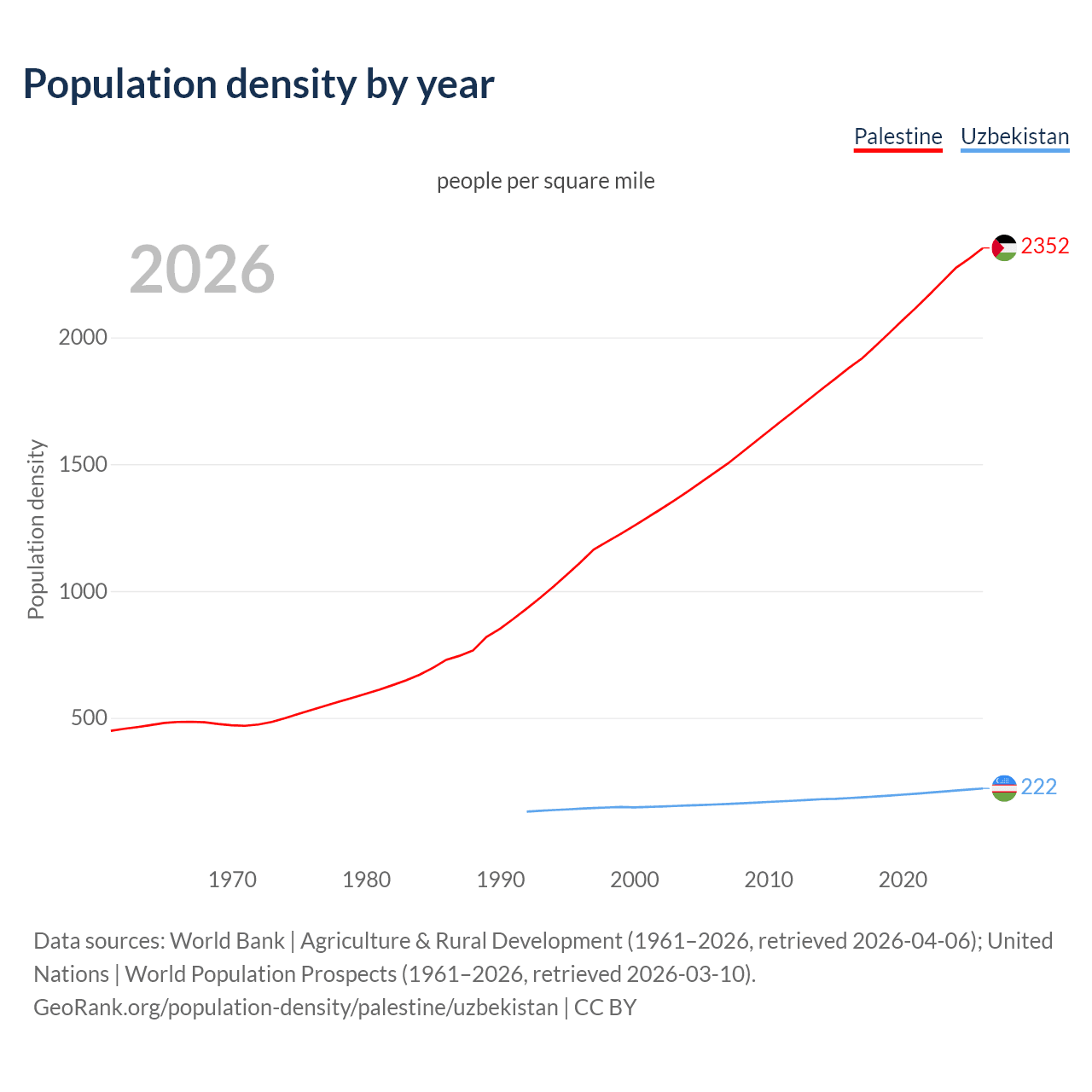 From 2006 to 2026, population density in Palestine increased by 60.5%, compared to a 39.9% growth in Uzbekistan.