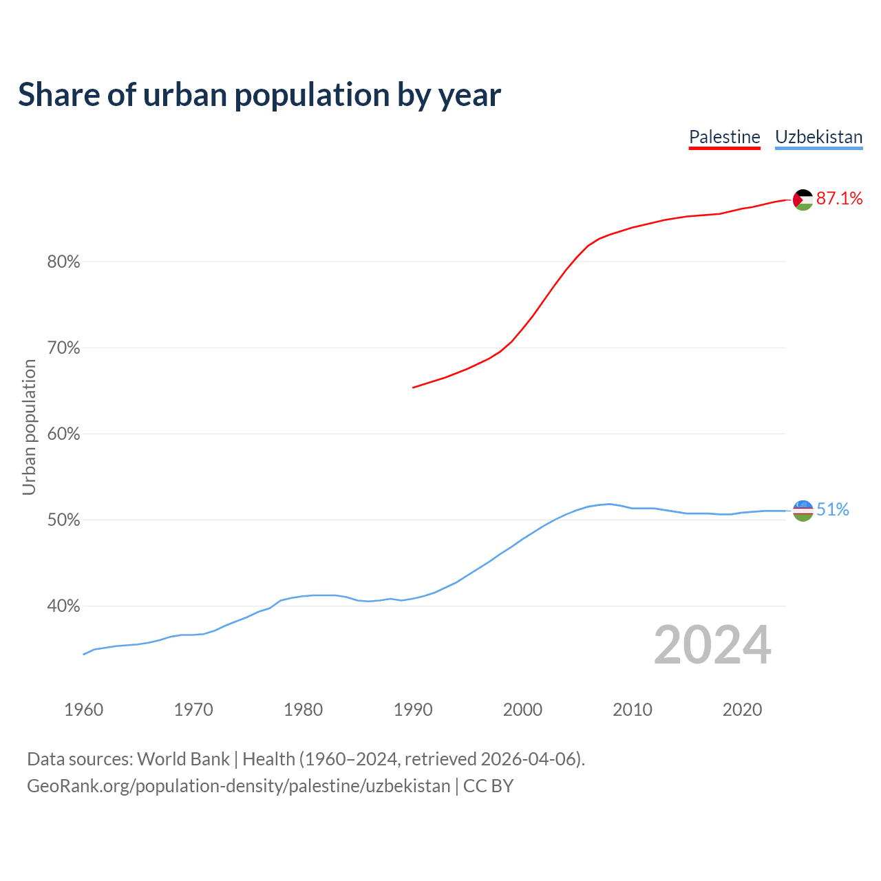 From 2004 to 2024, the share of urban population changed from 79% to 87.1% in Palestine and from 50.6% to 51% in Uzbekistan.