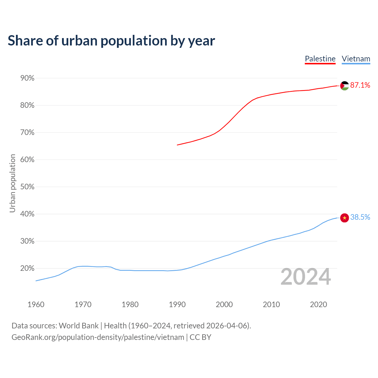 From 2004 to 2024, the share of urban population changed from 79% to 87.1% in Palestine and from 26.8% to 38.5% in Vietnam.
