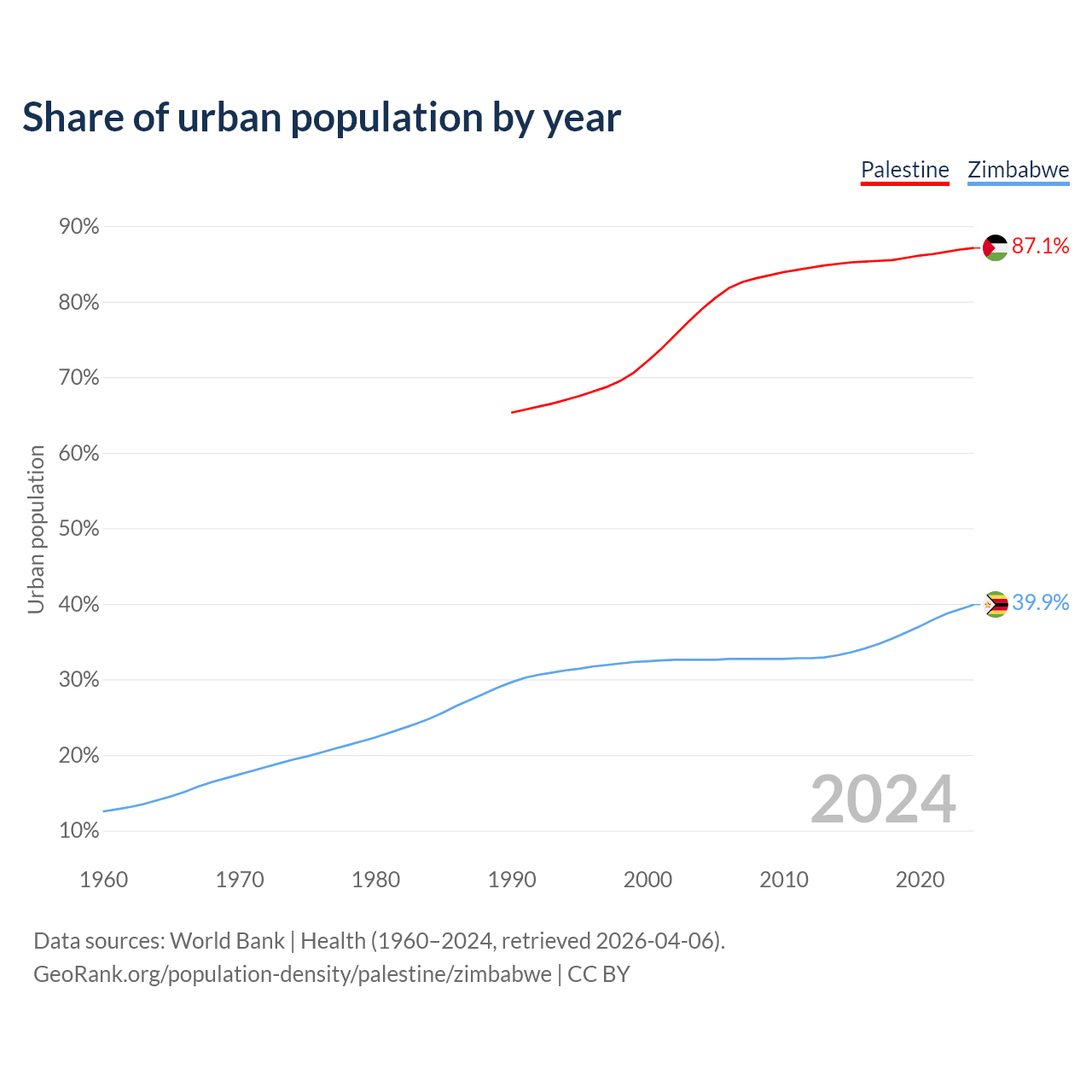 From 2004 to 2024, the share of urban population changed from 79% to 87.1% in Palestine and from 32.6% to 39.9% in Zimbabwe.