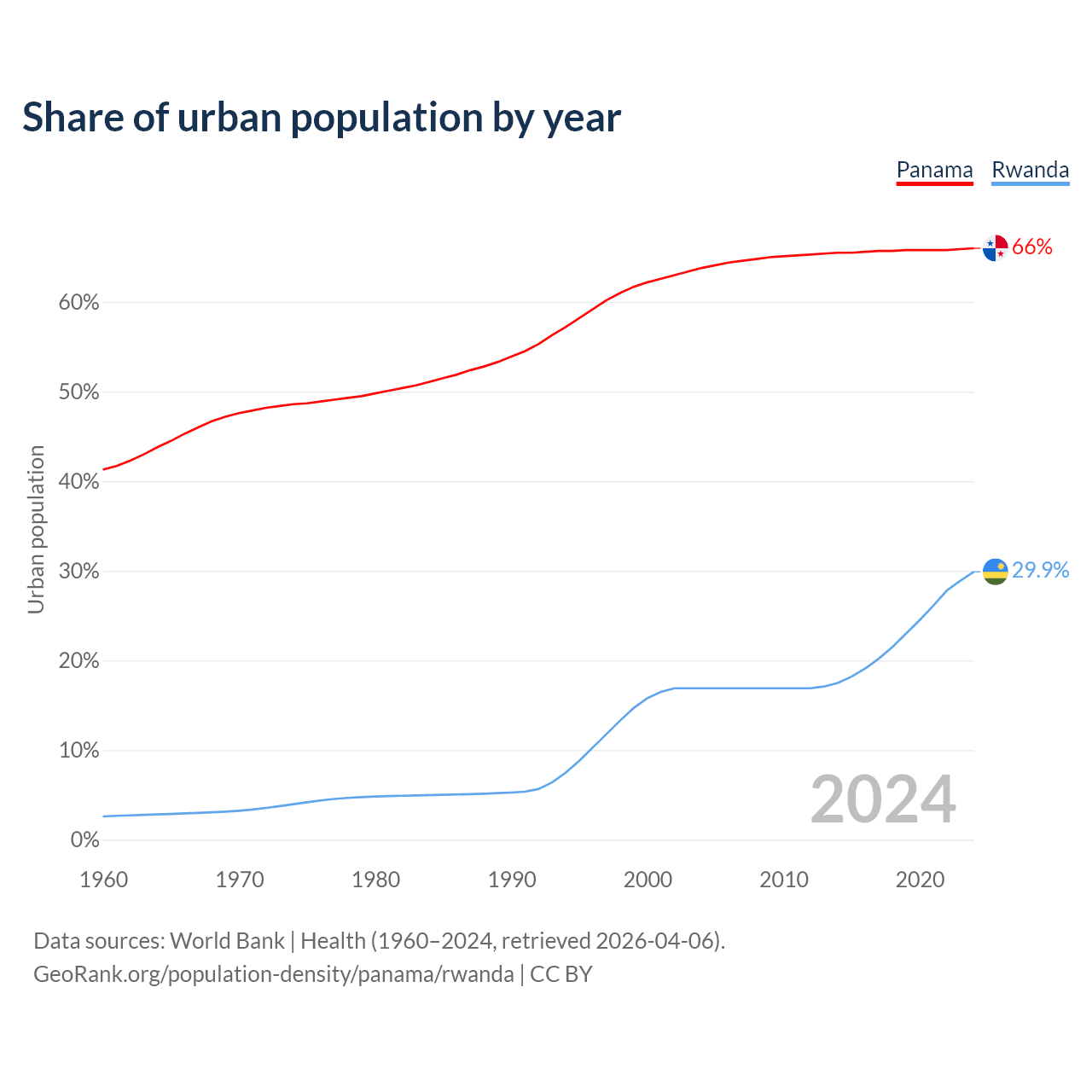 From 2004 to 2024, the share of urban population changed from 63.8% to 66% in Panama and from 16.9% to 29.9% in Rwanda.