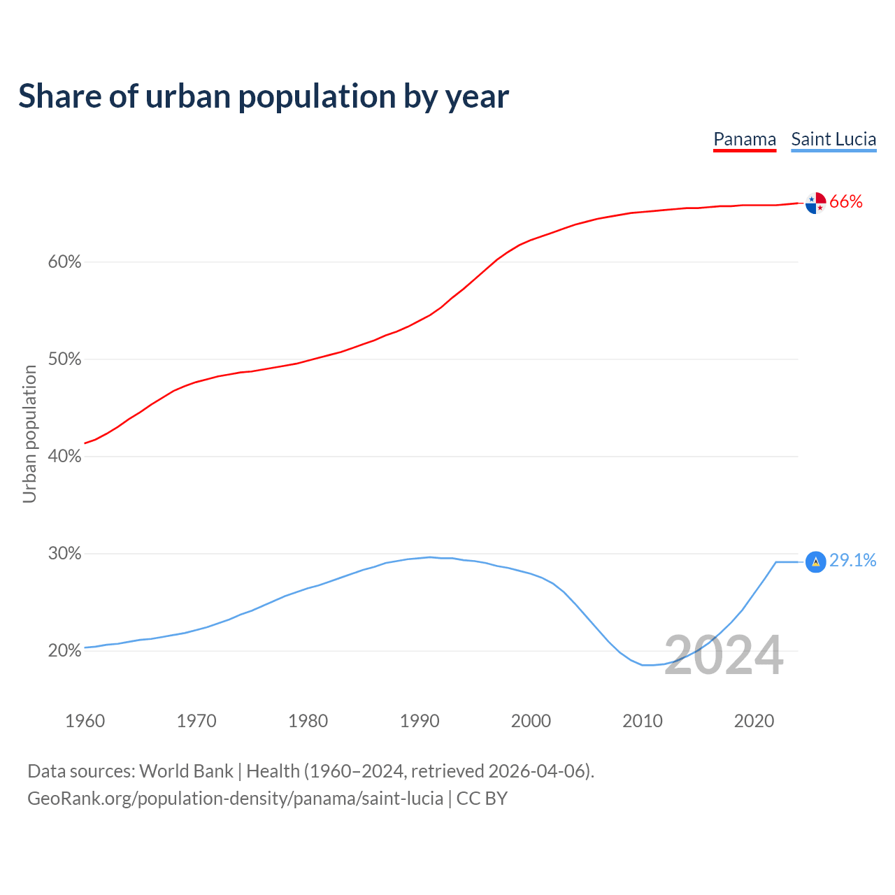 From 2004 to 2024, the share of urban population changed from 63.8% to 66% in Panama and from 24.8% to 29.1% in Saint Lucia.