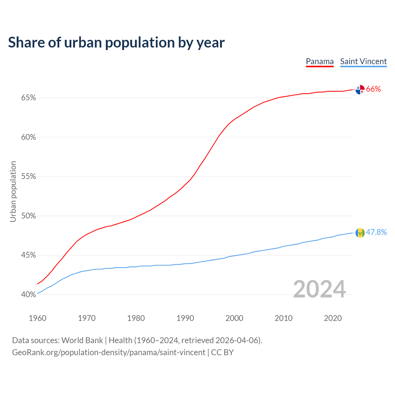 From 2004 to 2024, the share of urban population changed from 63.8% to 66% in Panama and from 45.4% to 47.8% in Saint Vincent.