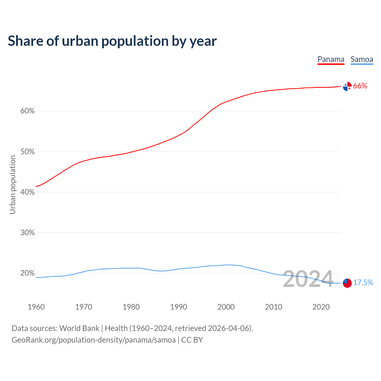From 2004 to 2024, the share of urban population changed from 63.8% to 66% in Panama and from 21.5% to 17.5% in Samoa.