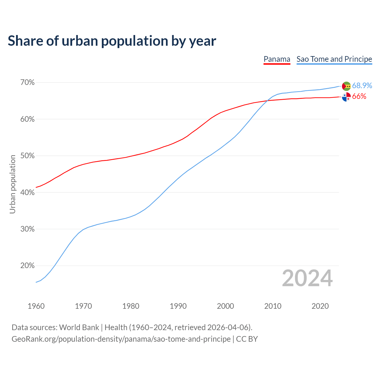 From 2004 to 2024, the share of urban population changed from 63.8% to 66% in Panama and from 57.9% to 68.9% in Sao Tome and Principe.