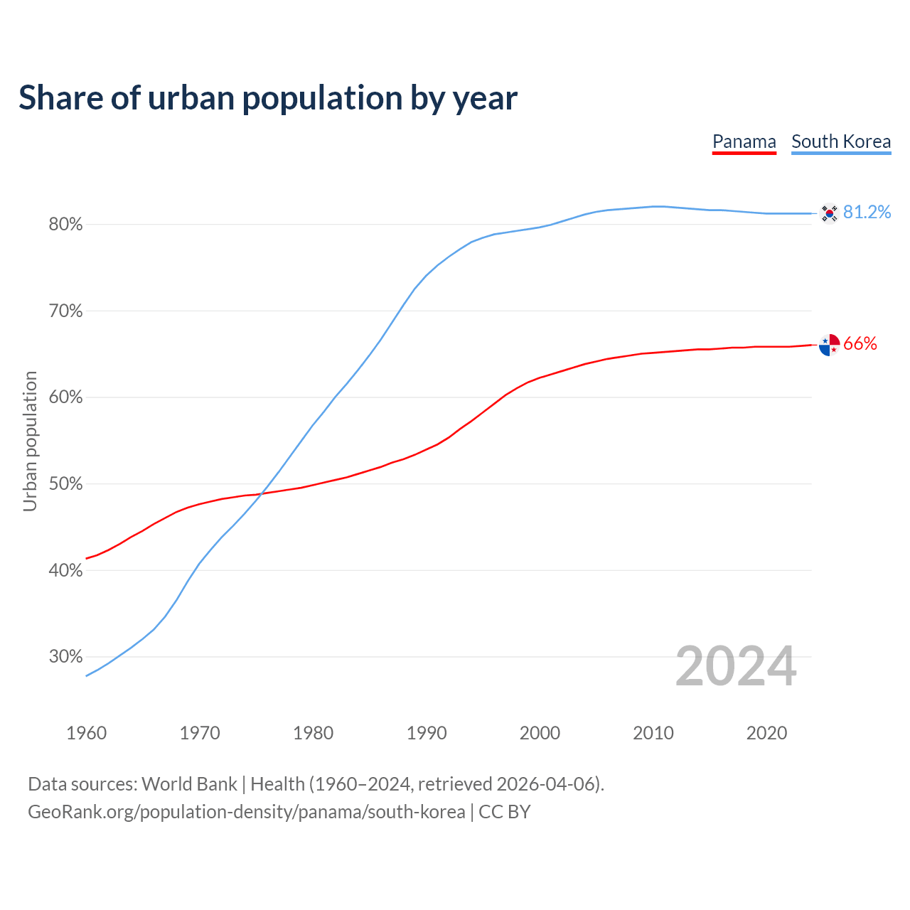 From 2004 to 2024, the share of urban population changed from 63.8% to 66% in Panama and from 81.1% to 81.2% in South Korea.