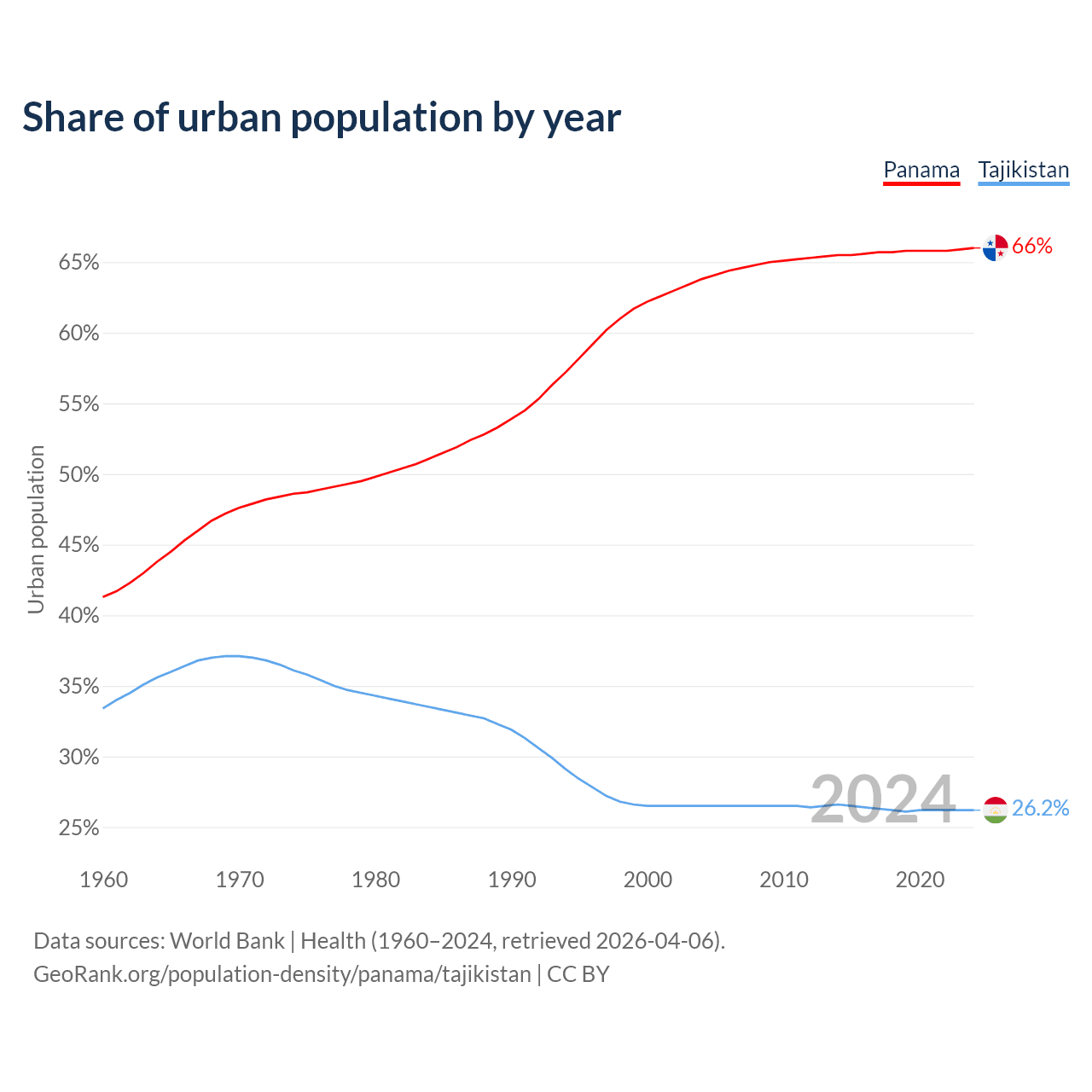 From 2004 to 2024, the share of urban population changed from 63.8% to 66% in Panama and from 26.5% to 26.2% in Tajikistan.