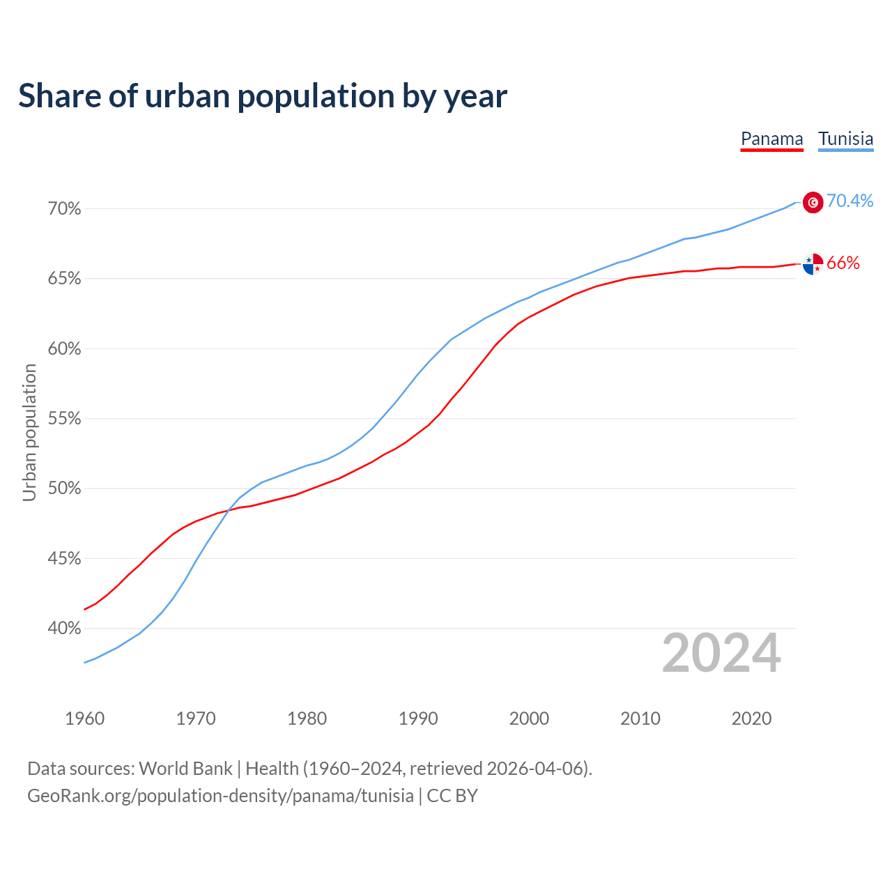 From 2004 to 2024, the share of urban population changed from 63.8% to 66% in Panama and from 64.9% to 70.4% in Tunisia.