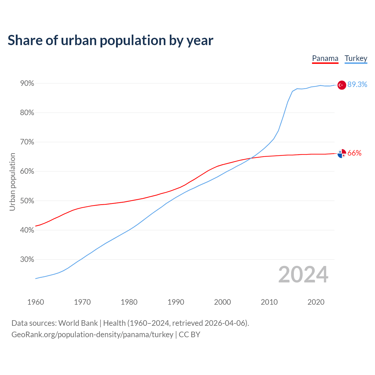 From 2004 to 2024, the share of urban population changed from 63.8% to 66% in Panama and from 62.4% to 89.3% in Turkey.
