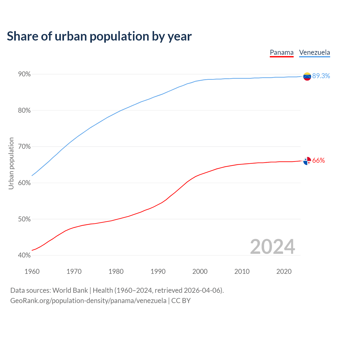 From 2004 to 2024, the share of urban population changed from 63.8% to 66% in Panama and from 88.6% to 89.3% in Venezuela.