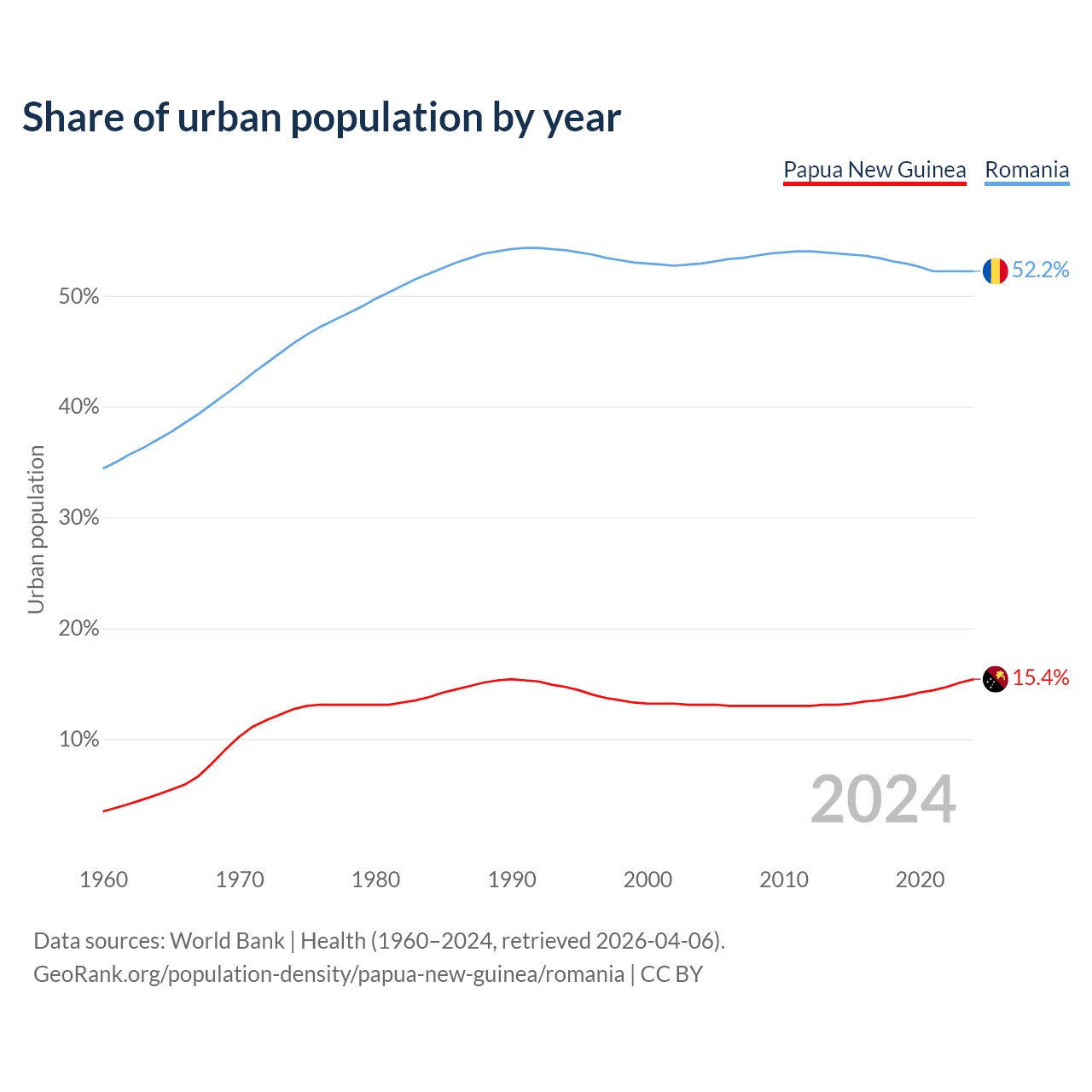 From 2006 to 2026, population density in Papua New Guinea increased by 62.3%, compared to a 11.1% decline in Romania.