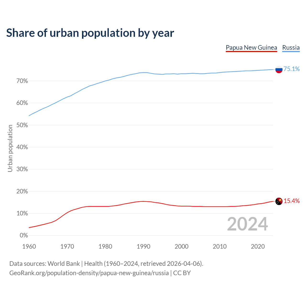 From 2004 to 2024, the share of urban population changed from 13.1% to 15.4% in Papua New Guinea and from 73.3% to 75.1% in Russia.