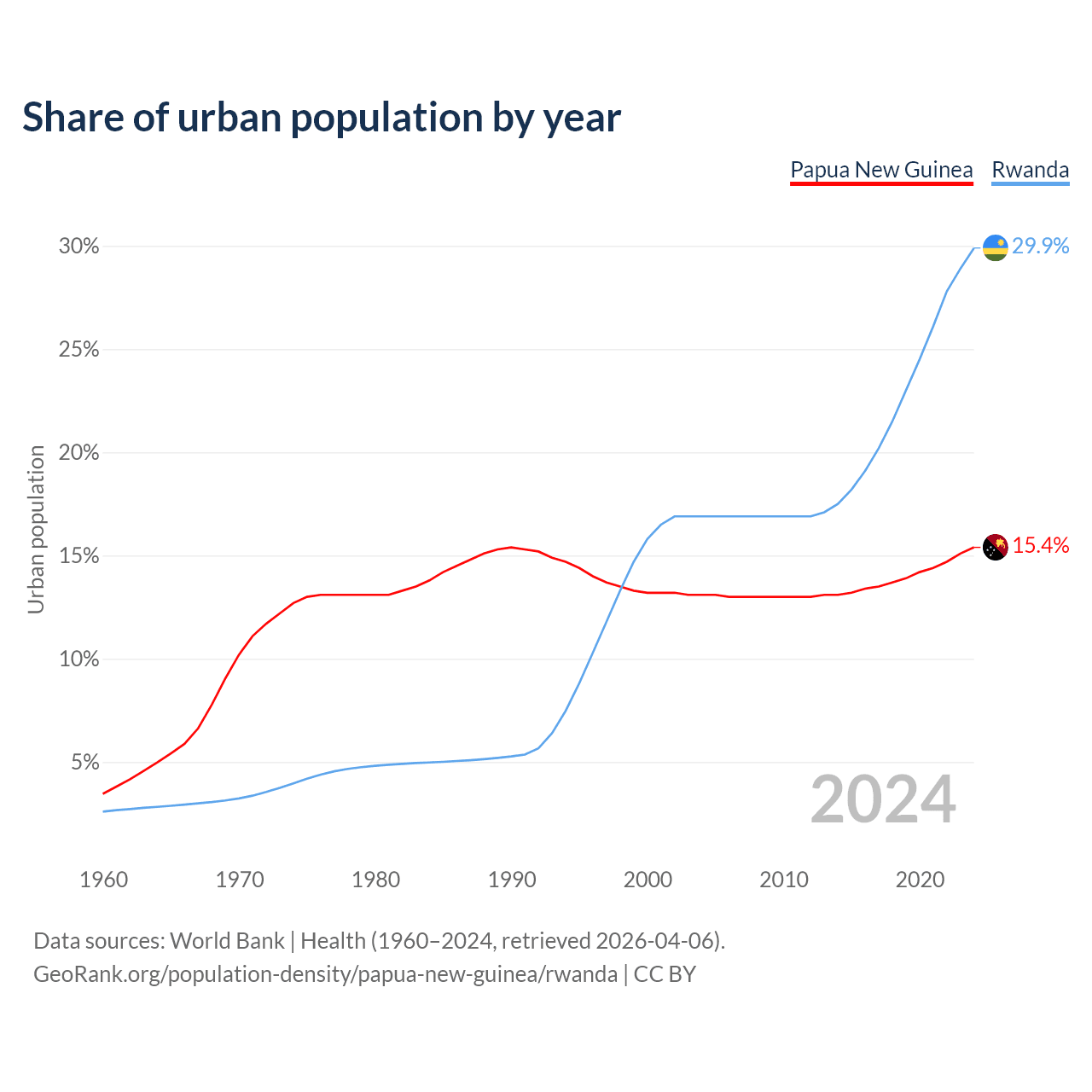 From 2004 to 2024, the share of urban population changed from 13.1% to 15.4% in Papua New Guinea and from 16.9% to 29.9% in Rwanda.