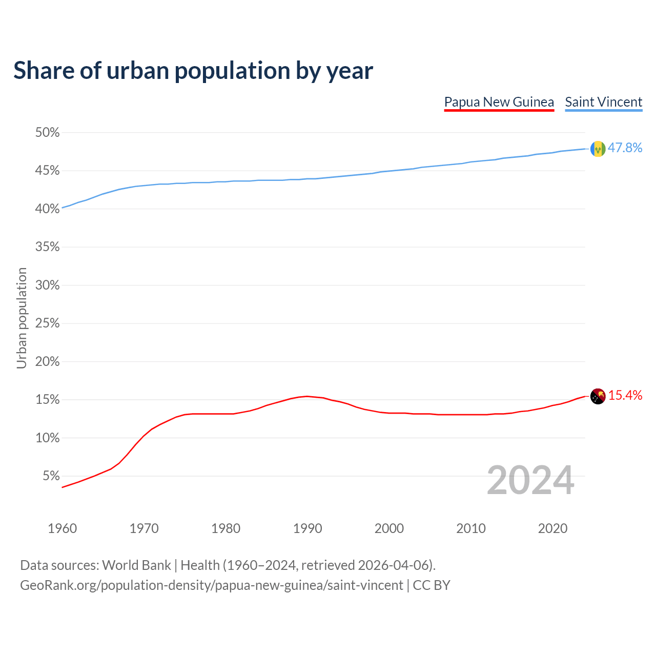 From 2004 to 2024, the share of urban population changed from 13.1% to 15.4% in Papua New Guinea and from 45.4% to 47.8% in Saint Vincent.