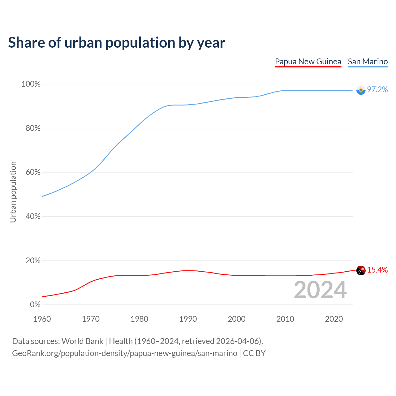 From 2004 to 2024, the share of urban population changed from 13.1% to 15.4% in Papua New Guinea and from 94.2% to 97.2% in San Marino.