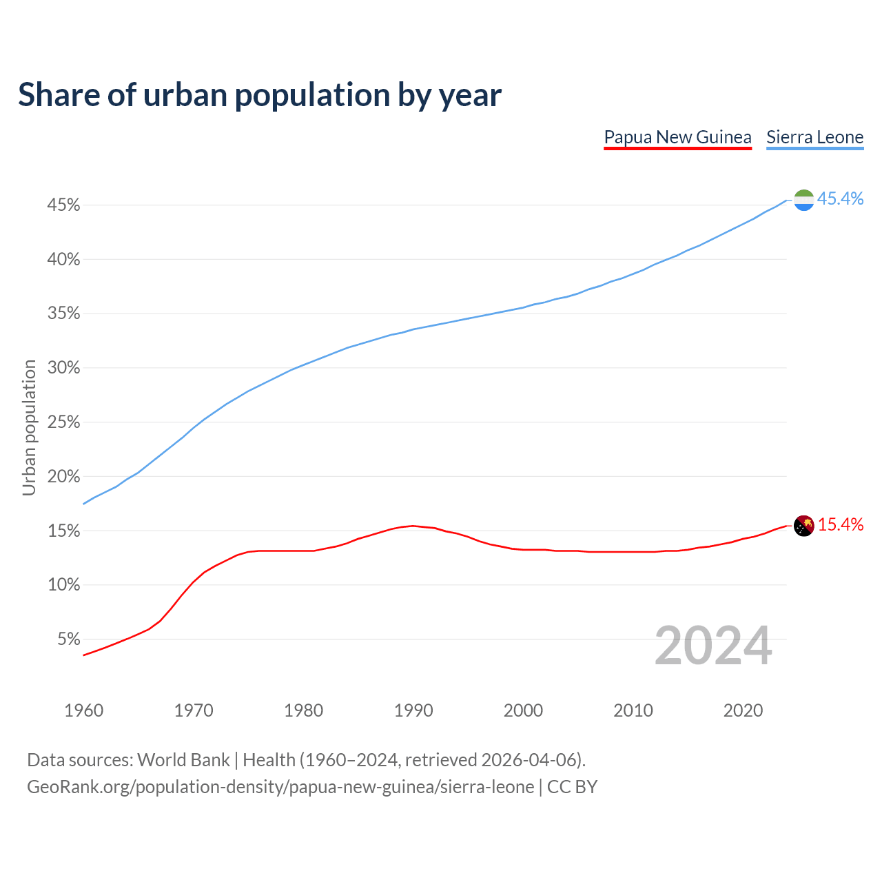 From 2004 to 2024, the share of urban population changed from 13.1% to 15.4% in Papua New Guinea and from 36.5% to 45.4% in Sierra Leone.