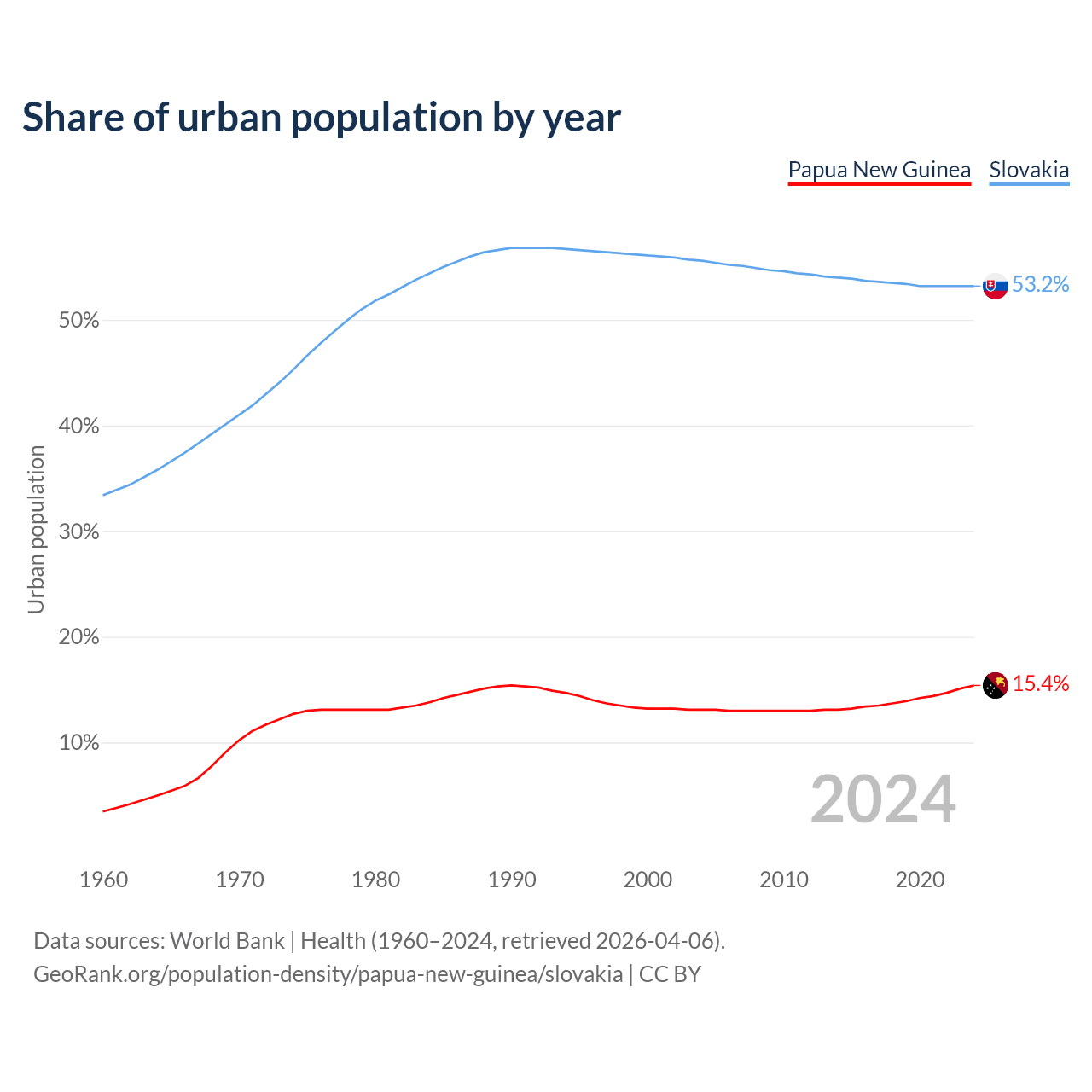 From 2004 to 2024, the share of urban population changed from 13.1% to 15.4% in Papua New Guinea and from 55.6% to 53.2% in Slovakia.