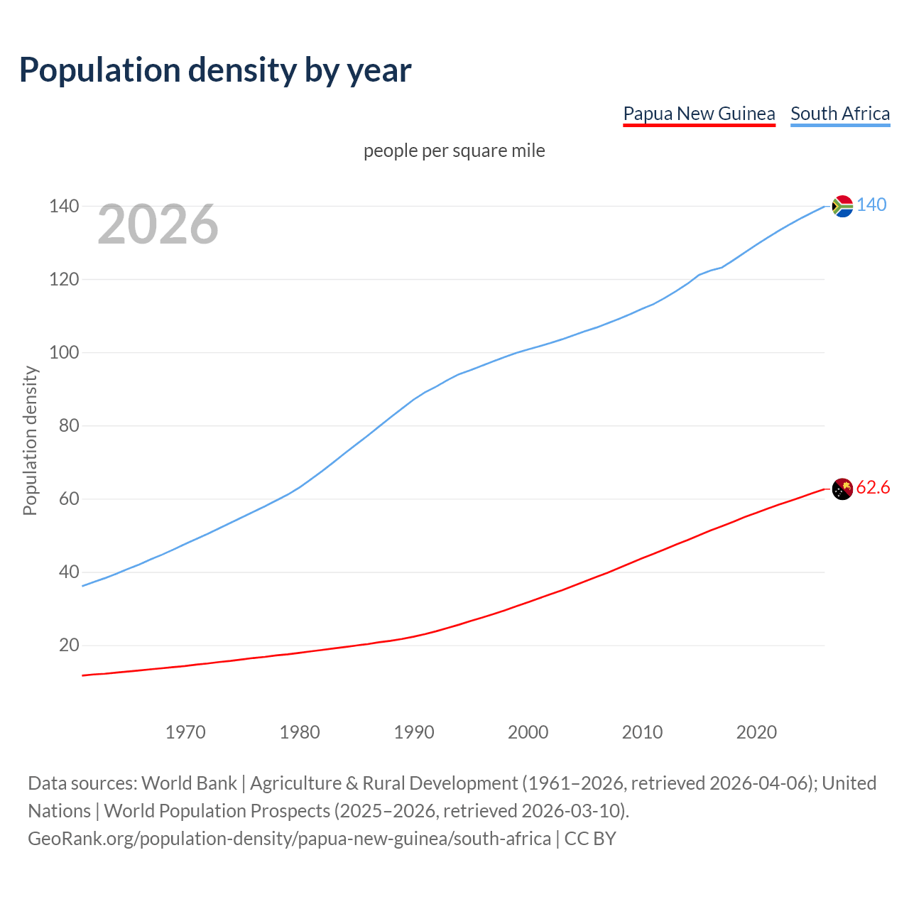 From 2006 to 2026, population density in Papua New Guinea increased by 62.3%, compared to a 31% growth in South Africa.
